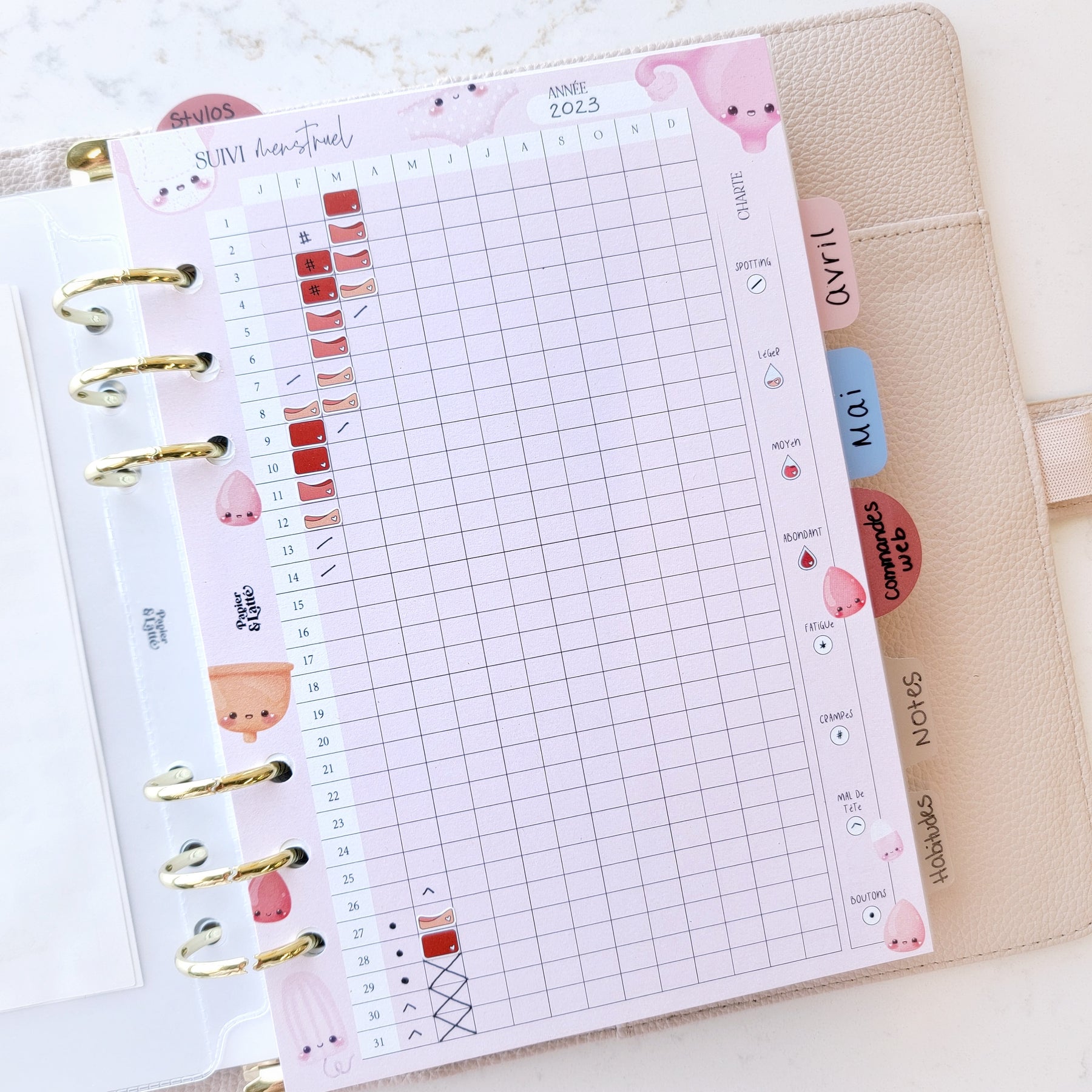 • Une page en carton contenant le calendrier annuel de suivi des règles
