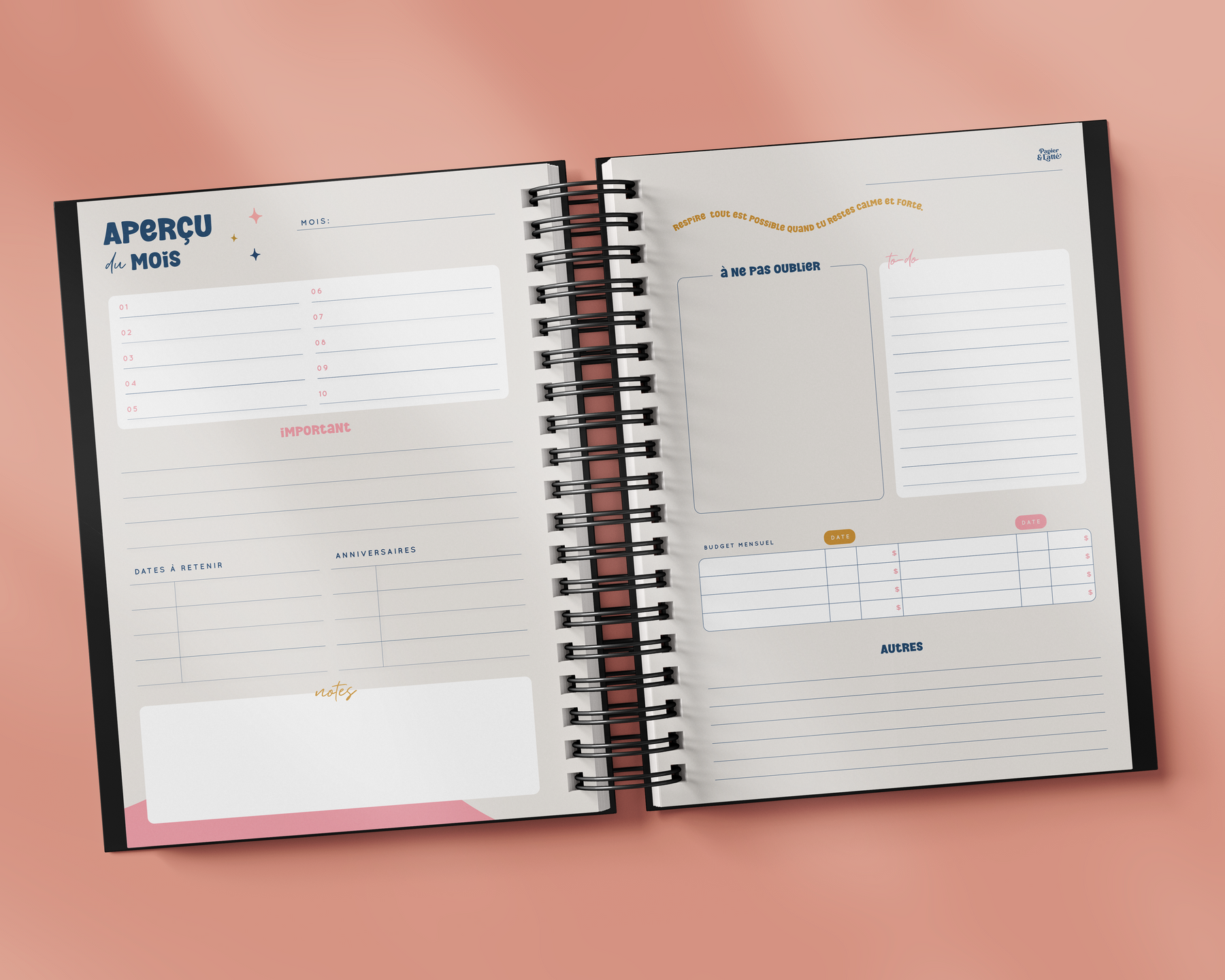 - Chaque mois contient 5 semaines sur 2 pages incluant une liste de priorité chaque jour.